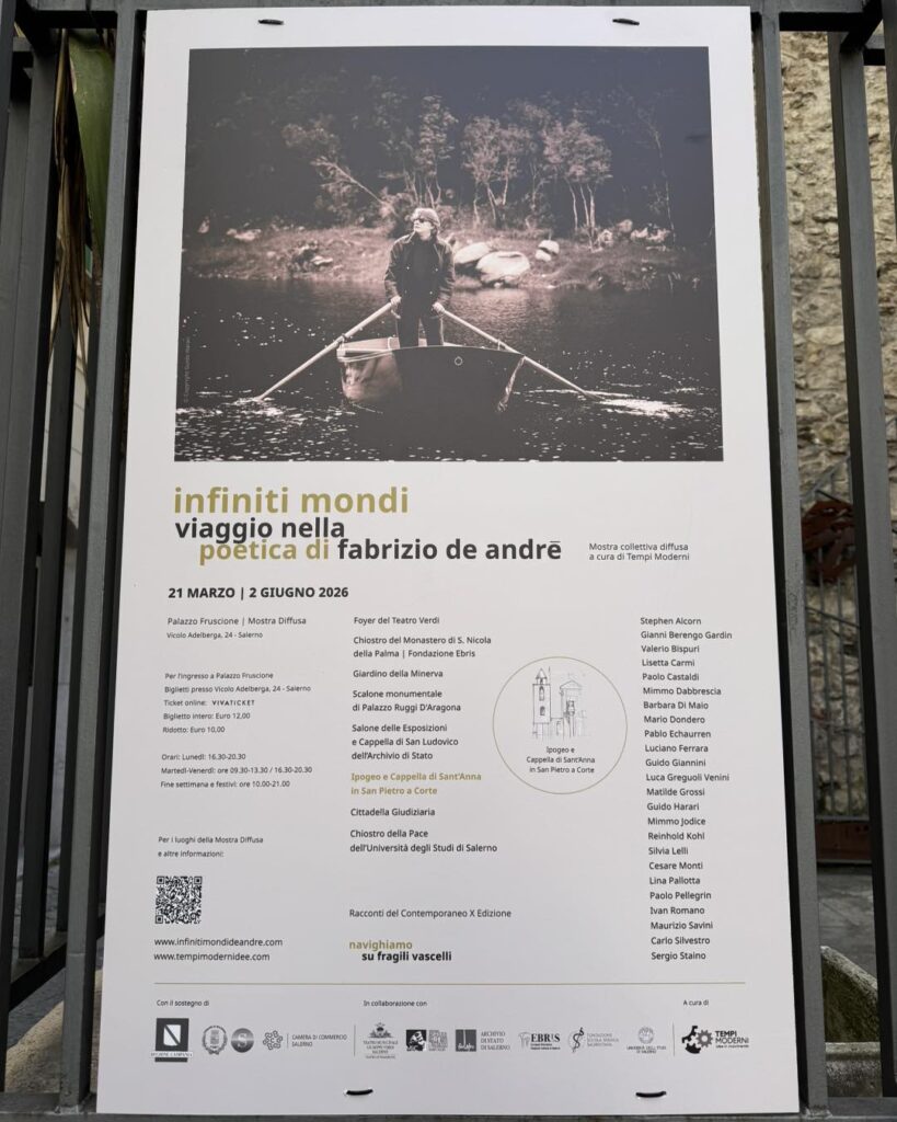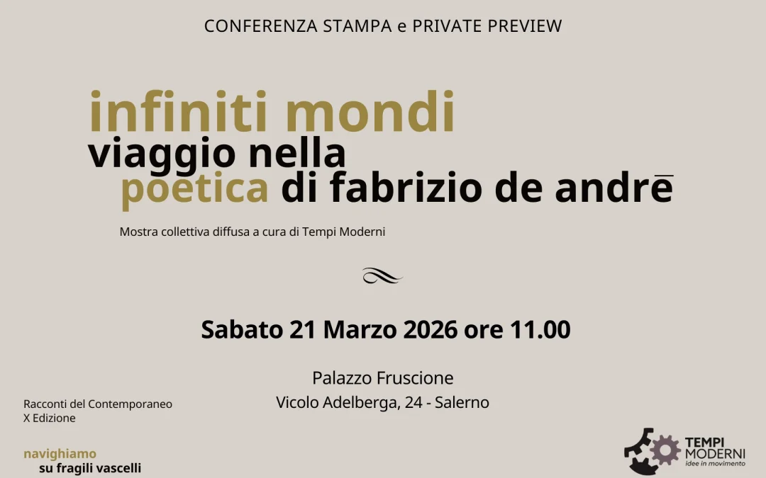 “Infiniti Mondi. Viaggio nella poetica di Fabrizio De André”, la mostra diffusa, ideata e curata dall’Associazione tempi_moderni_idee nel suo decimo anno di attività, che dal 21 marzo al 2 giugno 2026 animerà la città di Salerno.